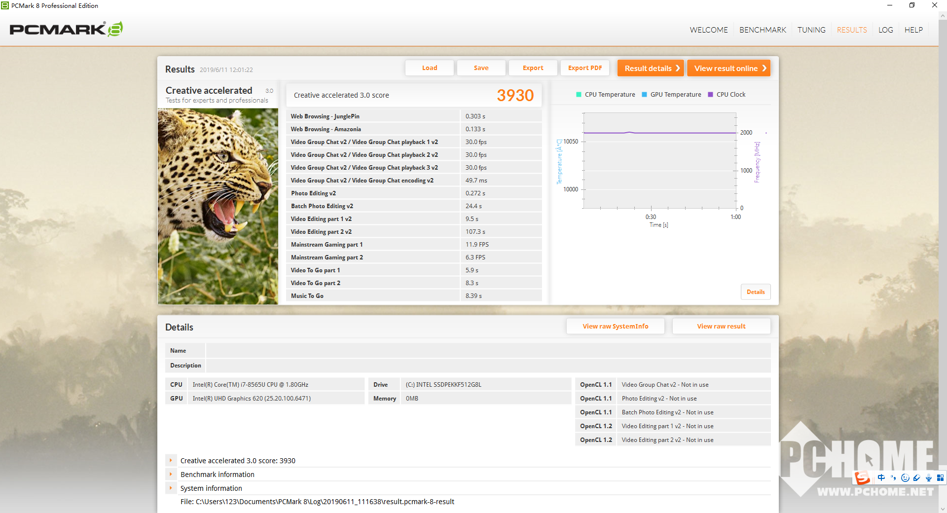 在经典的Home accelerate、Creative accelerate测试中得分为3665、3930,在Work accelerate测试中更是高达4983,接近五千分的专业级水准。ThinkPad X390 4G的整机性能还是十分出色的,作为一款轻薄商务本,完全可以满足日常的使用需求。