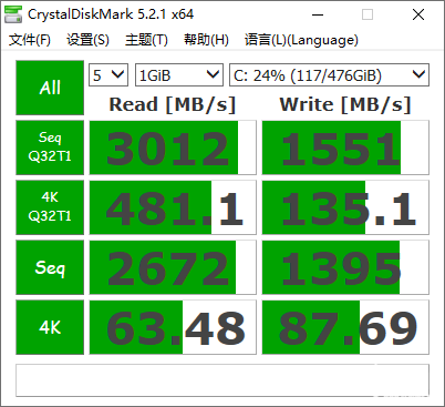 CrystalDiskMark是一款简单易用的硬盘性能测试软件,测试项目非常全面,涵盖连续读写、512K和4KB数据包随机读写性能,以及队列深度(Queue Depth)为32的情况下的4K随机性能。在CrystalDiskMark测试中,最大连续读取速度为3012 MB/s,写入1551 MB/s,4K随机读写速度方面,读取为63.48MB/s,写入为87.69 MB/s,整体表现十分出色。