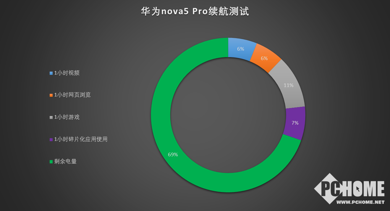 华为nova5 Pro配备了一块3500mAh容量的电池,对于6.39英寸屏幕的手机而言,这个电池容量可以提供足够的安全感。4小时的连续高强度使用后,华为nova5 Pro还剩下69%的电量,续航能力相当出色了。
