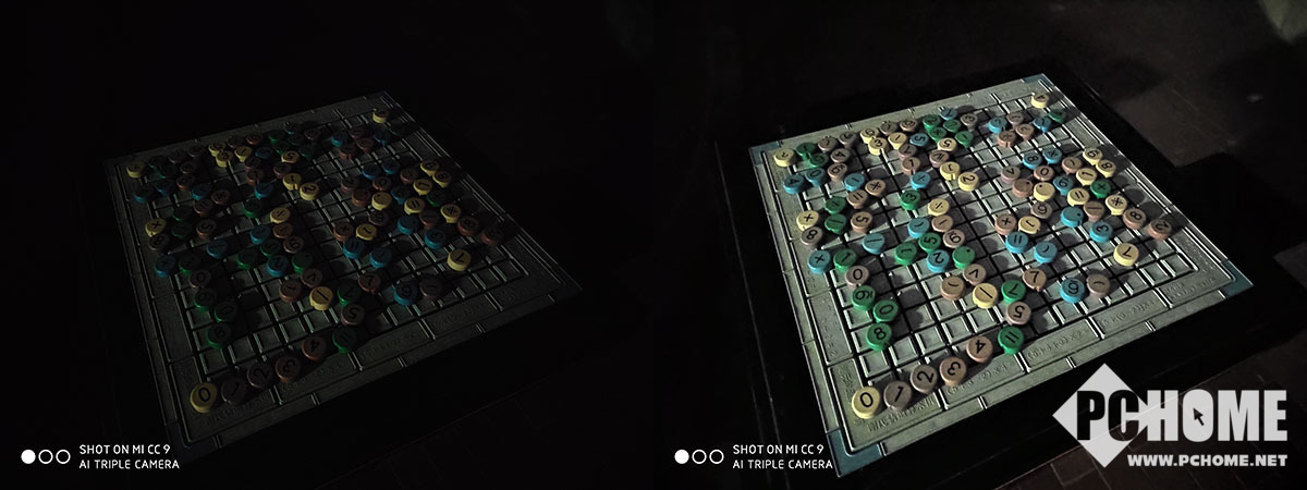 夜景的拍照上,小米CC9的拍照效果显得十分明亮,对拍照的主题表现力十足,对复杂光线条件下的控制很好,高光的压制不错,在暗部上也有着不错的细节表现力。专门的夜景模式,支持手持条件的长快门拍照,通过样张对比情况得以看出,夜景模式下的亮度如同白昼一般,能够清楚的看清黑暗中的棋子表面数字,非夜景模式的拍照则完全无法看清。不过夜景模式的拍照需要手动开启,自动AI模式拍照几乎不会自动触发夜景模式拍照。