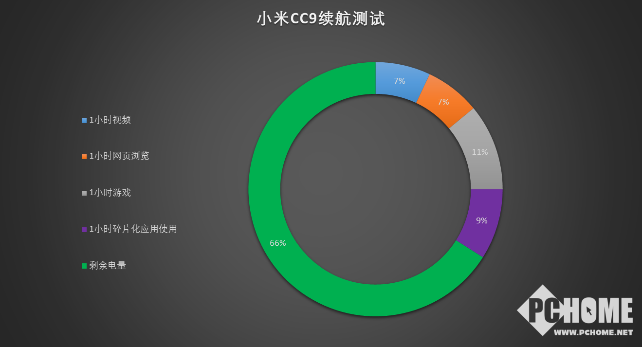 小米CC配备了4030mAh大容量电池,结合深度睡眠模式2.0、AI智能亮度调节屏幕、应用智能后台省电,以及限制三方APP自启动和链式启动等措施,小米CC9获得了优秀的续航表现。经过我们实测,4小时的高强度使用后,小米CC9还能剩下66%的电量,依照这种使用强度来看,高强度使用用户每天充电一次即可,正常用户可以两天充电一次。