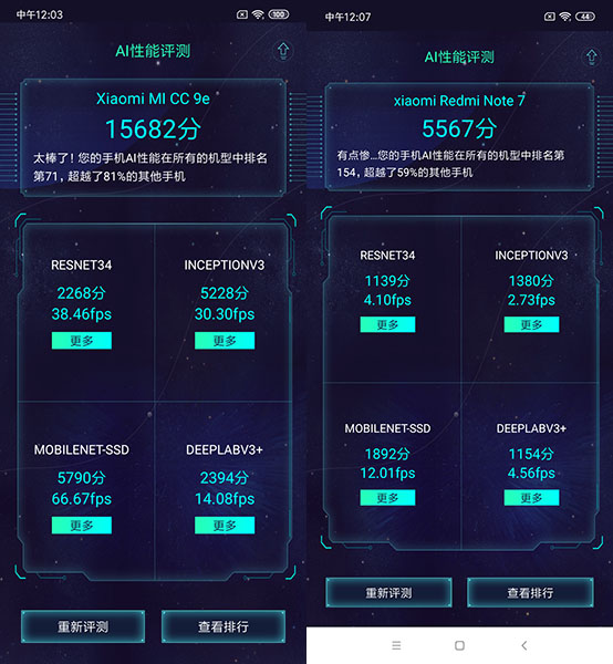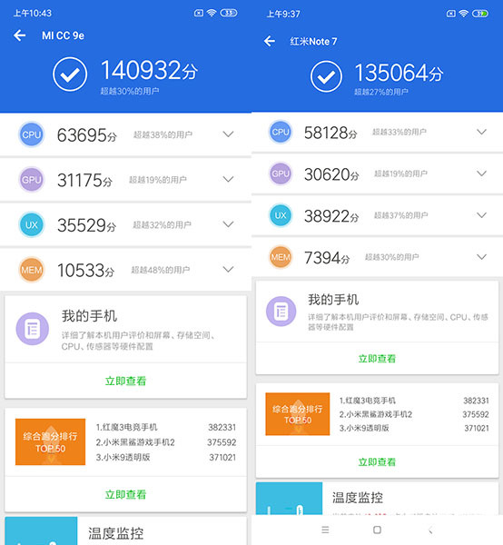 从跑分成绩来看,使用骁龙665的小米CC9e,跑分成绩比起使用骁龙660的红米Note 7并没有高出很多。从各单项的成绩对比来看,骁龙665的CPU成绩会更强一些,更先进的工艺技术还是有优势。图形性能上略有领先,但幅度并不明显。存储方面的高得分,更多的是由于UFS 2.1闪存的使用导致。