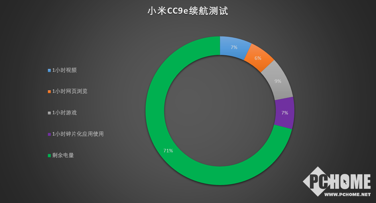 小米CC9e配备了与小米CC9相同的4030mAh大电池,在更省电的骁龙665与更小尺寸的HD+屏幕下,其续航表现要更为出色。4小时的使用过后,剩余电量足有71%,这是一个相当健康的高电量,足够使用很长时间。高强度用户使用1天是毫无压力的,正常使用用户甚至可以两天一充。
