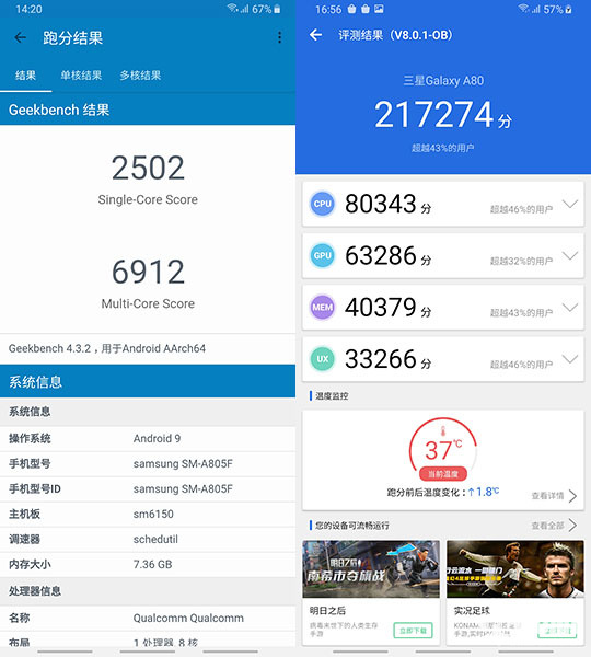 首先来看三星Galaxy A80的跑分表现,最新的安兔兔评测V8版本跑分超过21万分,是非旗舰级别手机的高分了。GeekBench的得分成绩则更亮眼,其单核得分2502,多核得分6912,其中单核成绩甚至超越了上一代旗舰骁龙845,A76大核与8nm工艺制程表现确实出色。而单核性能的表现,与实际使用中的场景更为贴切,三星Galaxy A80在使用时十分顺畅。