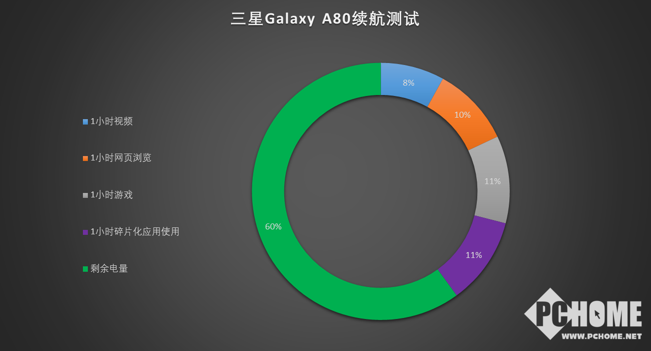 三星Galaxy A80配备了3700mAh电池,实测4小时的连续使用剩余60%电量,其整个耗电情况比较平均,没有某一项使用上特别费电。实际使用中也有着这种感觉,其电量十分坚挺,即使剩余20%电量,也能够撑起足够的时间让我们寻找电源充电。在快充支持上,三星Galaxy A80提供了25W快充支持,这是旗舰级的Galaxy S10都不具备的快充表现,使用中1小时的时间即可充电至90%。