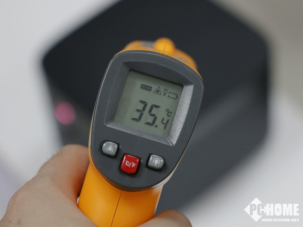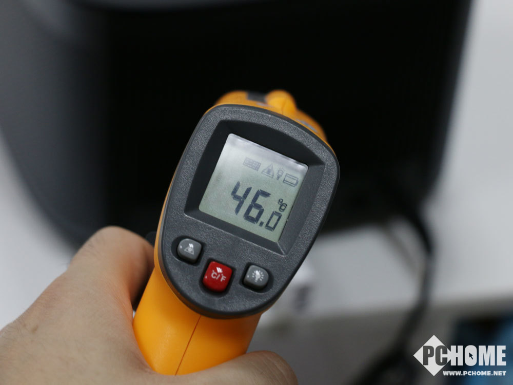 通过热感枪测试在半个小时的使用之后,极米H3前端位置温度在35度左右,后方的散热出风区域温度在46度左右,且散热的噪音较低,在日常的使用中基本可以忽略不计,效果还是值得肯定的。