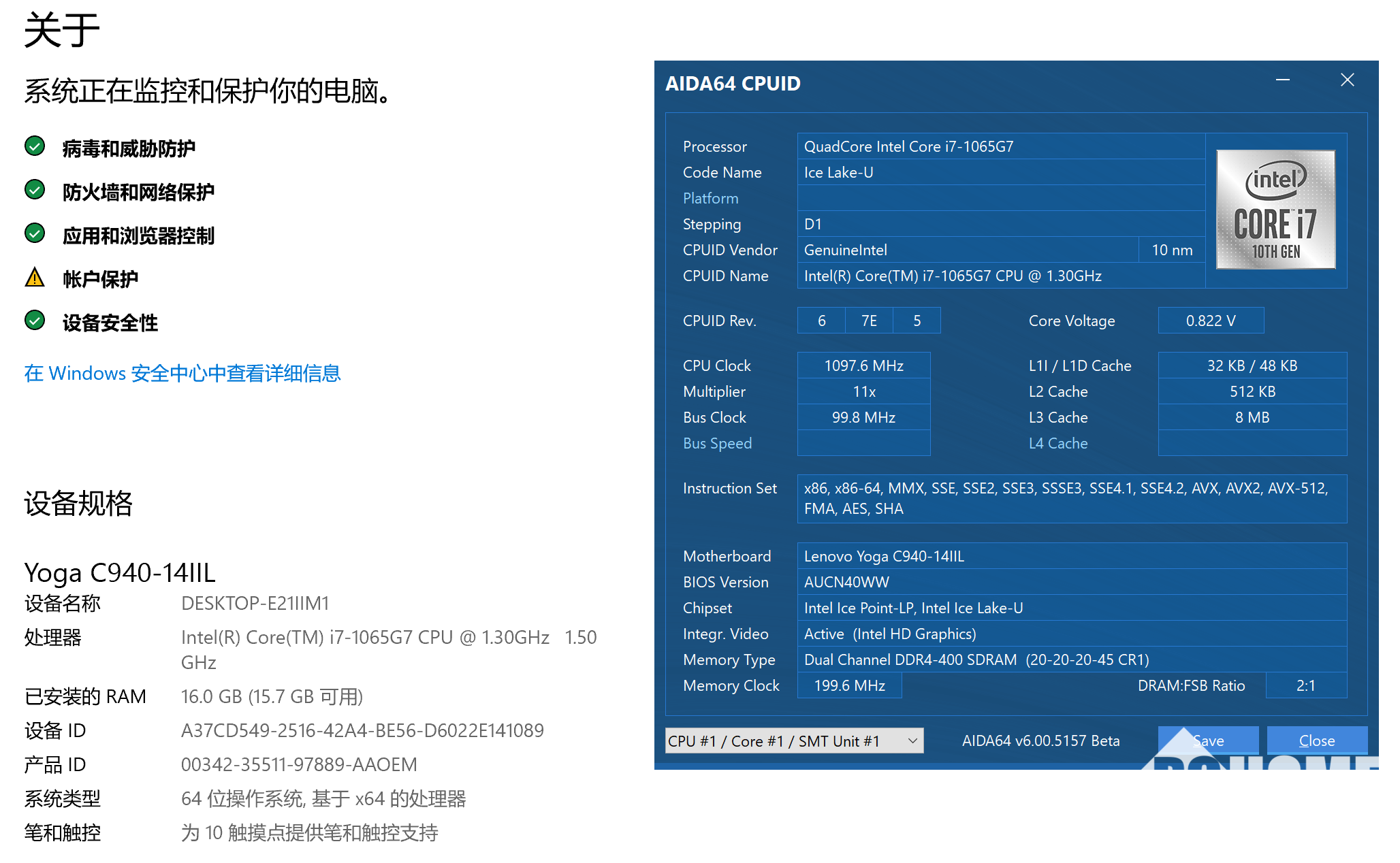 本次评测的YOGA C940搭载酷睿i71065G7处理器。Core i7 1065G7采用4核心8线程设计,默认主频为1.3GHz,最高可睿频至3.9GHz,3级缓存为8MB,TDP为15W。GPU方面,i5 1065G7集成了锐炬IRIS PLUS核芯显卡中最高的64个EU单元,融入可变速率着色功能以提升渲染性能,并支持VESA自适应同步显示标准。官方表示其图形性能比上代提升一倍,不仅可以流畅运行1080p游戏,而且可以帮助影视后期设计师更快的处理4K视频编辑、高分辨率照片处理等应用。