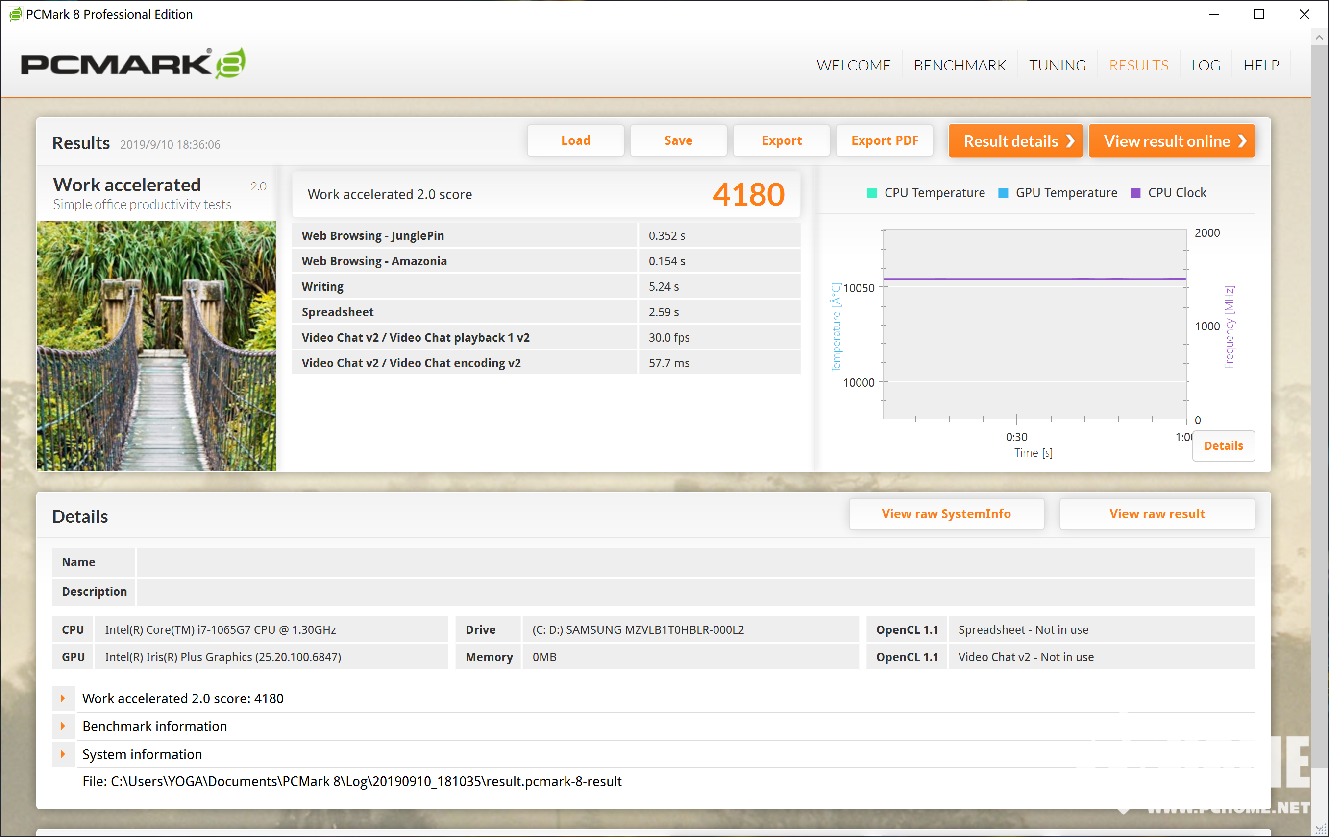 整机的综合性能方面,在PCMARK 8中经典的Work accelerate测试中得分为4180,YOGA C940的整机性能还是不错的,作为一款轻薄笔记本产品来说,满足日常的办公、设计需求不会有什么问题。