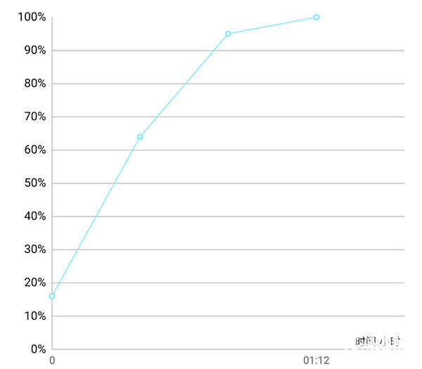 在快充支持上,OPPO Reno2 Z提供了VOOC 3.0闪充技术支持,其采用了全新充电算法,让手机在最后的充电阶段也能够保持高速充电。VOOC 3.0闪充从1%充满至100%电量,比起VOOC 2.0闪充耗费的时间缩短了23.8%,充电效率提升十分明显。经过我们实测,从16%的低电量充满至100%满电,总共耗时1小时12分钟,充电曲线中可以看到,在充电至65%电量之前,一直保持了高功率充电,之后的充电速度并未有明显降低。