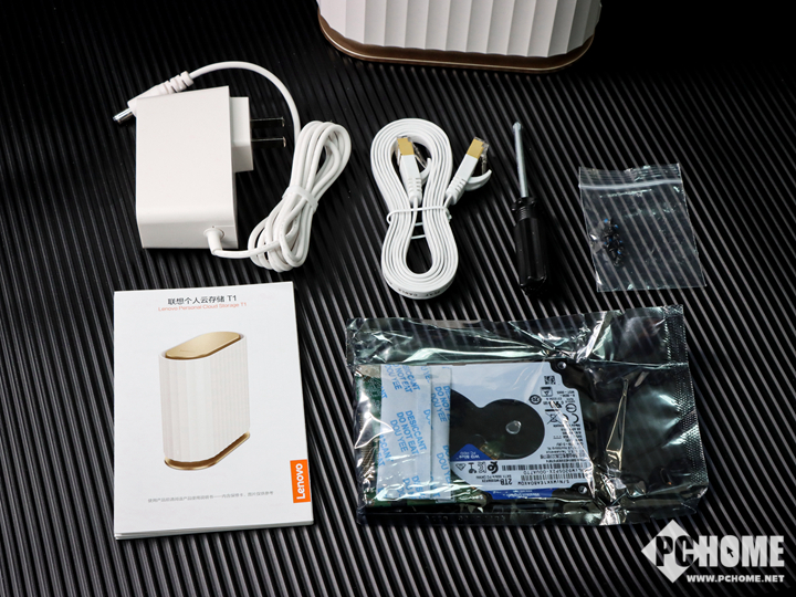 包装里面包括联想个人云存储主机、电源适配器、网线、2 TB机械硬盘一块、10颗螺丝及螺丝刀。