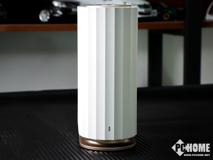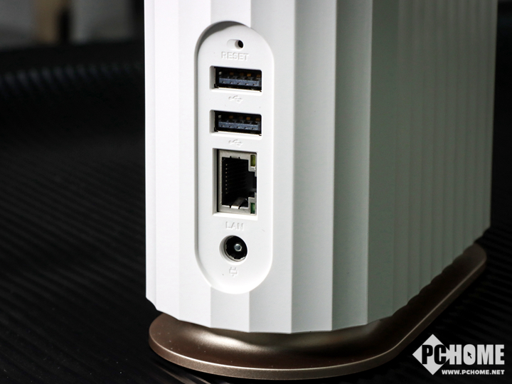 上下两部分采用了淡金色,与机身的大面积白色形成撞色。整体颜值颇高,紧凑的设计,加上使用2.5英寸的硬盘,整机体积控制的较好,不会占用太多的桌面空间,放在家里当成摆件也没问题。