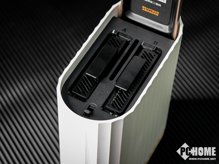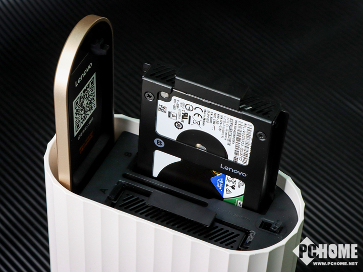 机身顶部上盖的“Lenovo”标识区域为按压方式开盖,按下弹开之后就可以看到A\B两个硬盘位,支持RAID及LARGE模式,上盖内里印有设备绑定二维码,用来绑定APP。