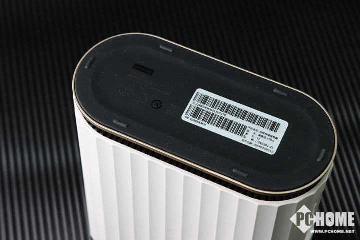 机器底部采用了六个防滑脚垫,保证了放置的稳定性,底部产品铭牌上印有联想个人云存储型号标识,及序列号等信息。