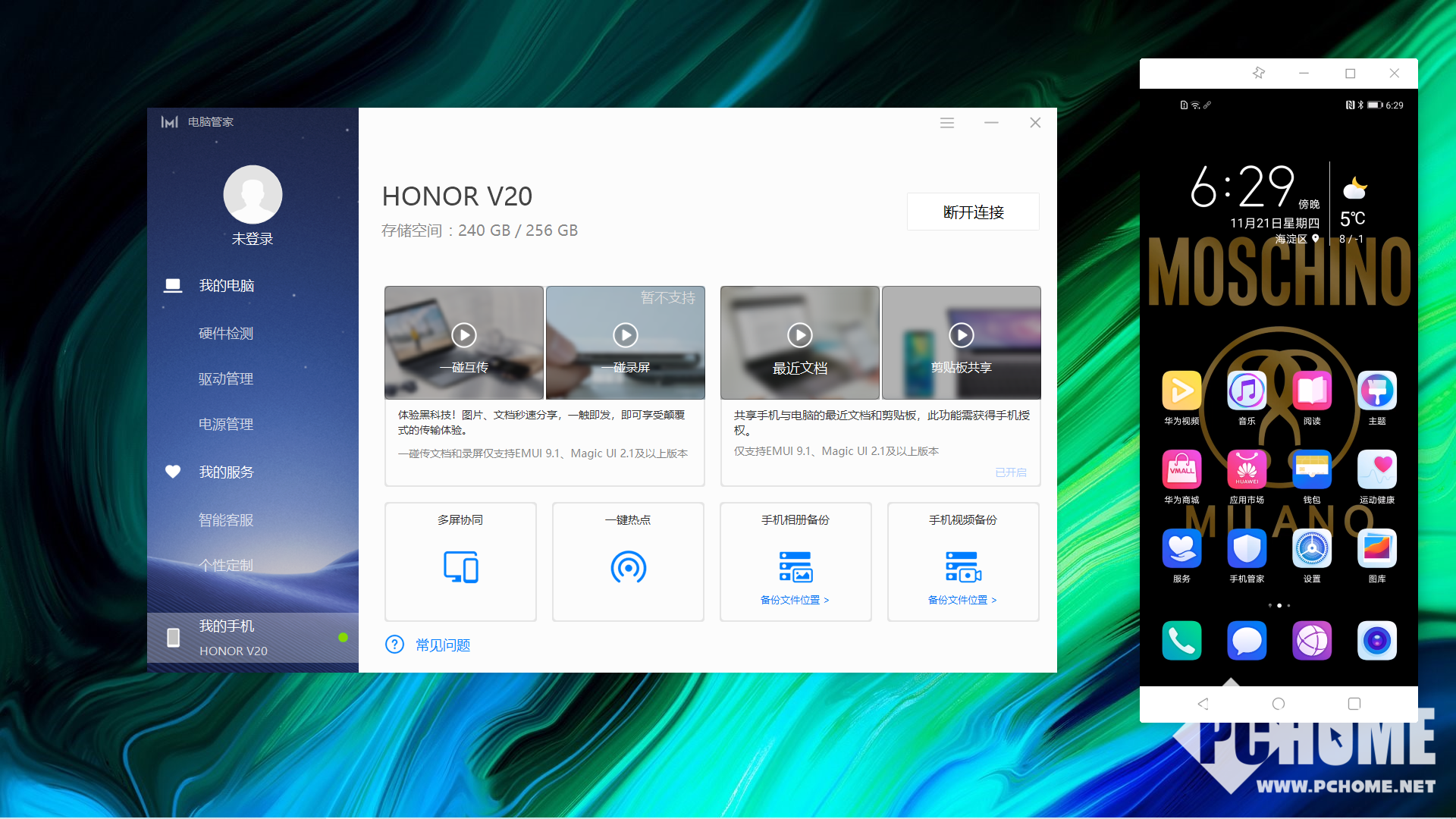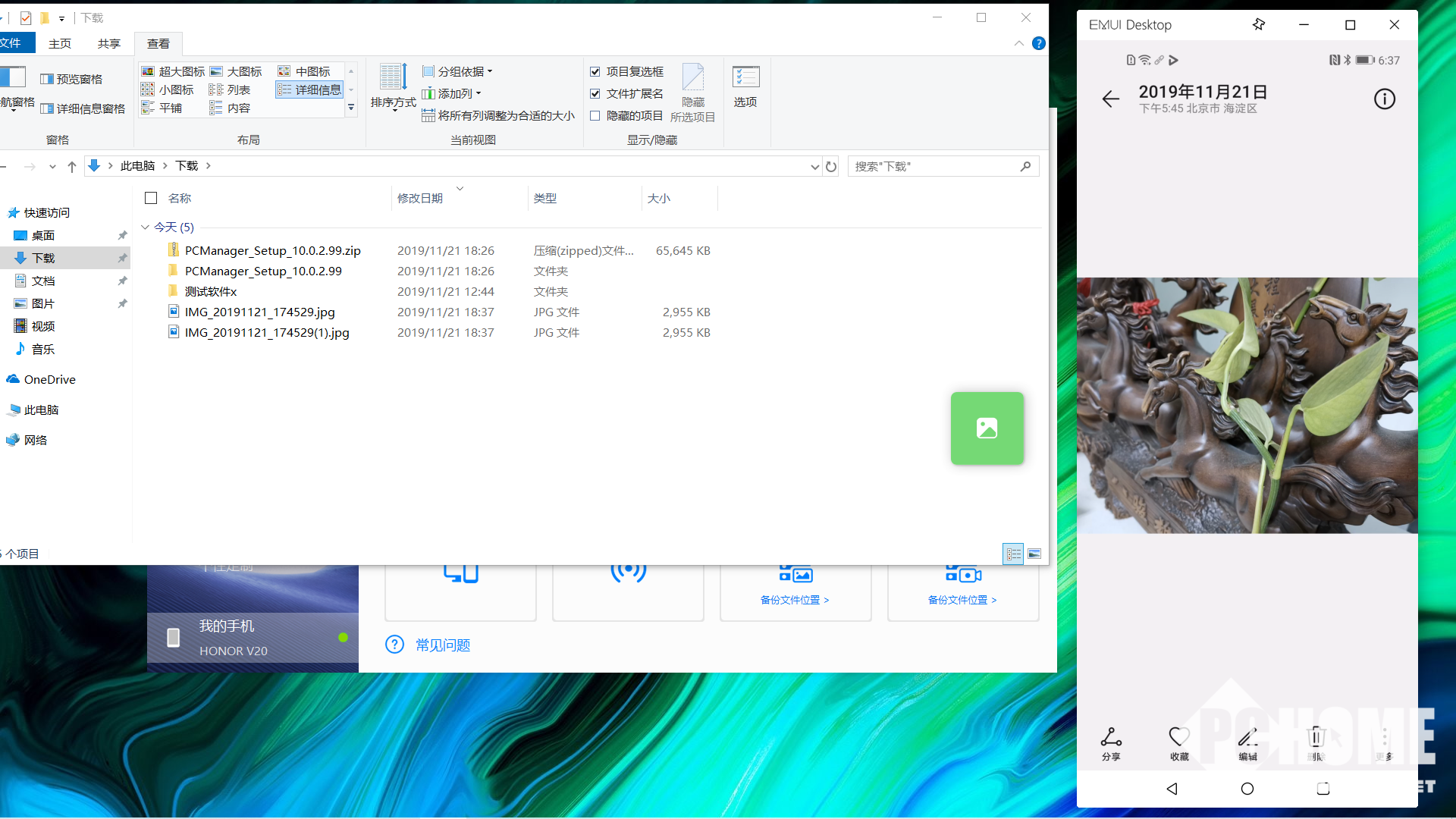 *手机与PC之间文档互传:手机与电脑配对完成后,电脑屏幕上即可显示手机界面,相当于在电脑上操作你的手机。这个时候传输文件非常简单,只需通过拖拽,即可在荣耀MagicBook 14锐龙版和手机间双向传输图片、视频等文件,大小不受限制,且传输速度很快。