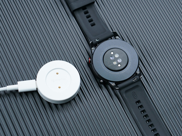 荣耀MagicWatch 2厚度为10.7mm,佩戴时不会显得十分臃肿,不含表带的重量也仅有41g,佩戴体验还是比较不错的。荣耀MagicWatch 2采用了磁吸式的触点充电底座,小巧轻便的圆形充电桩便于携带。