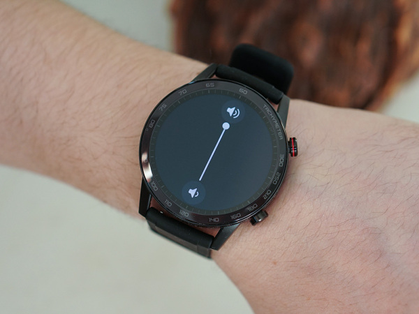 荣耀MagicWatch 2在手表右侧有着两颗实体按键,上键为开关机和菜单键,下键为运行模式选择键,而在拨打电话时候,上下按键又可以作为音量调节键使用。上键有着红圈点缀,设计感提升明显。