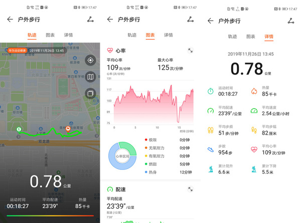 荣耀MagicWatch 2会根据心率波动来确定有氧、无氧和燃脂的时间,十分贴心。笔者在体验自由训练和户外步行时的心率、有氧耐力、燃脂、热身等时长都有记录,十分详尽。