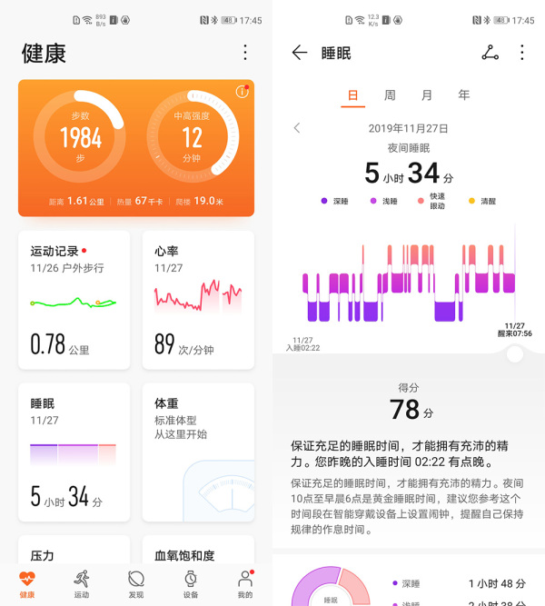 以上图示是运动健康APP对笔者睡眠情况的打分,并提醒笔者需要保证充足且科学的睡眠时间。荣耀MagicWatch 2结合华为AI技术,准确识别入睡困难、睡眠浅、夜间易醒、早醒、多梦、作息不规律6大类典型睡眠问题,并提供了上百条睡眠改善建议及个性化睡眠服务。