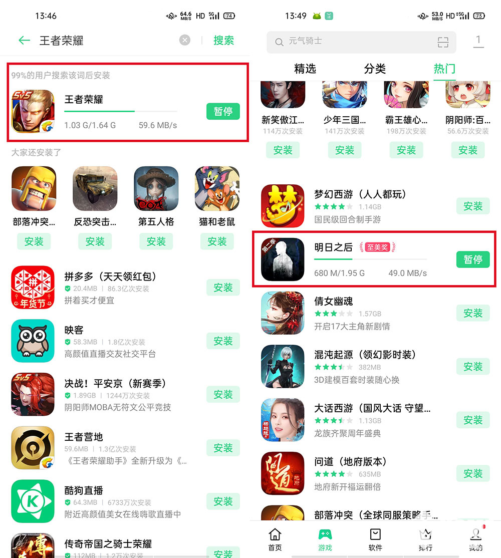 那么Reno3 Pro的5G在实际使用中体验如何呢?我们尝试在软件商店内下载几款游戏。
