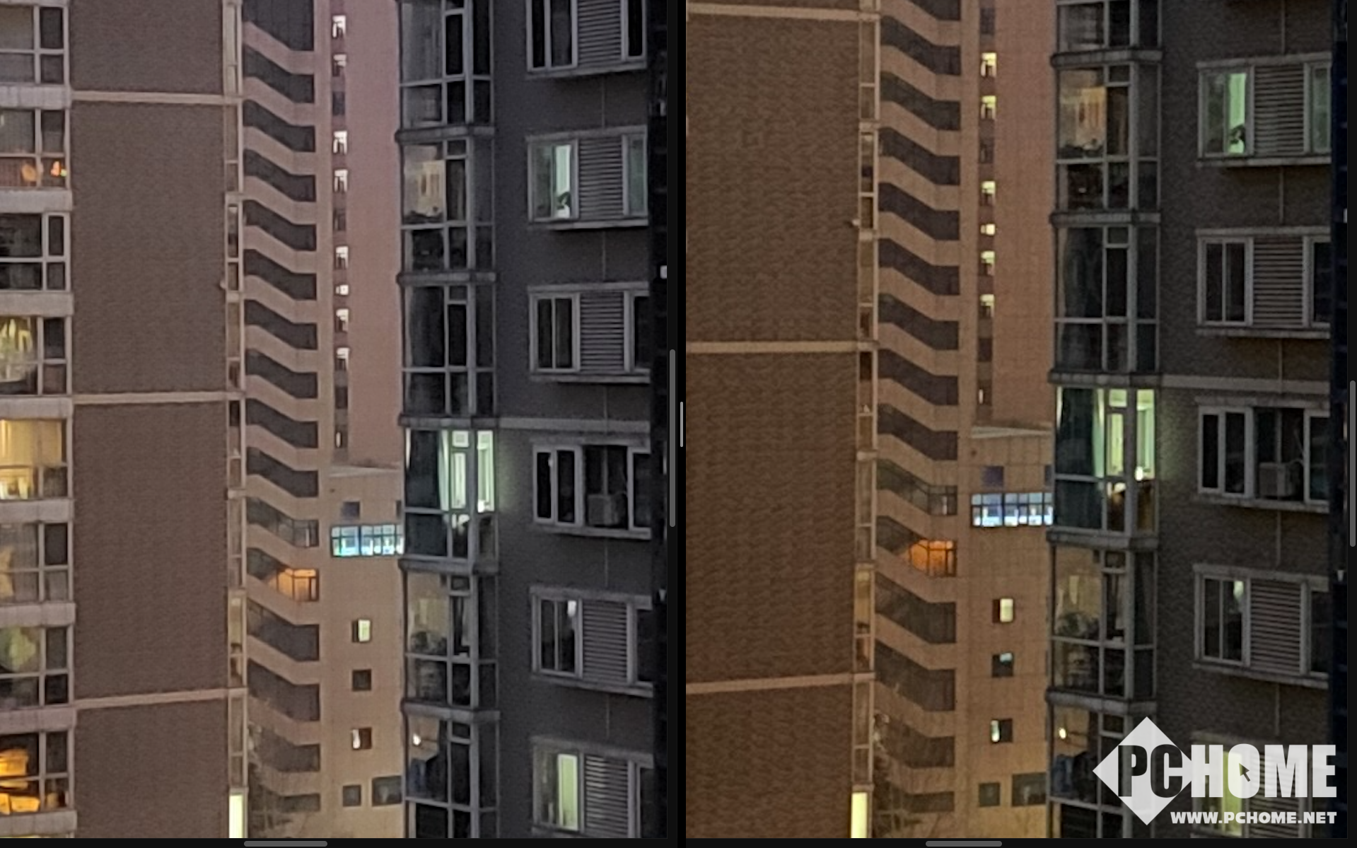 夜晚环境,三星与苹果均为自动模式的情况下,iPhone 11 Pro的夜晚模式通过长曝光带来了更好的画面亮度和更清晰的画面效果。三星的颜色还原有些许偏白,并且放大看楼层之间的纹理也不如iPhone 11 Pro清晰,所以在夜晚环境下还是iPhone胜。