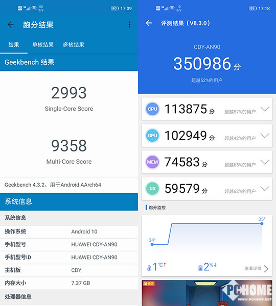 安兔兔评测与GeekBench是最常见的跑分测试,荣耀30S在安兔兔评测中超过35万分;GeekBench4单核得分逼近3000分,多核超过9000分。分数相比上一代提升幅度十分明显。