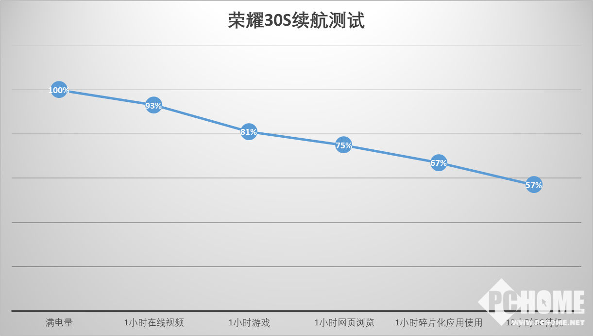 续航方面,荣耀30S搭载了一块4000mAh大容量电池,提供了坚实的续航基础,与麒麟820出色的功耗表现搭配可以进一步的省电。经过我们的实际测试,4小时的连续高强度使用与12小时5G待机后,荣耀30S剩余电量还有57%,这对于一部5G手机而言,续航表现已经很不错了。