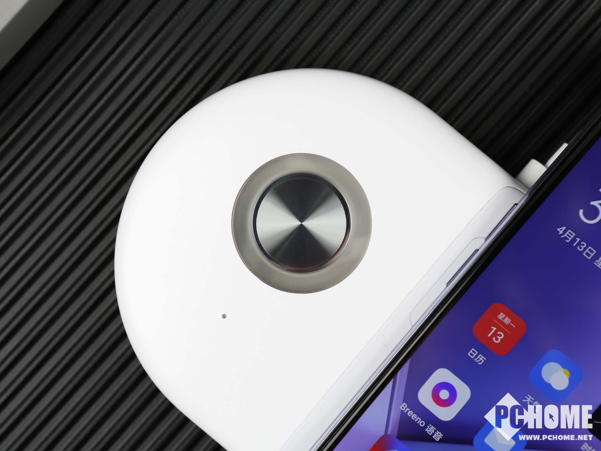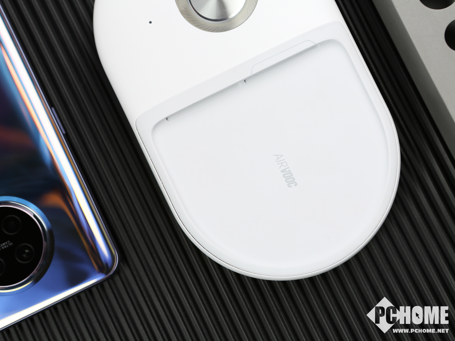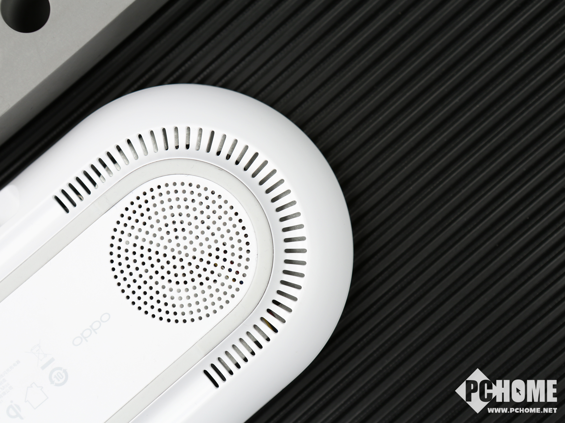 AirVOOC无线充电板整体采用的是硅胶+塑料的材质,通体为纯净的白色。在方式手机的位置采用了硅胶材质,一方面可以保护手机背板不被划伤,另一方面也可以使得手机平放在充电板上的时候不会随意的滑动,提供牢靠的稳定放置。而在塑料材质的位置则是一枚肉眼可见的镂空区域,上层覆盖有同心圆的高光金属片和一圈的透明塑料,可以清楚的看到里边的风扇扇叶,在充电的时候这部分扇叶也会进行转动,将内部的热量散出。翻到背部,可以看到AirVOOC充电板有非常大范围的散热开孔,为40W的高充电功率提供充足的散热效能,使其持续以最高充电功率运转。