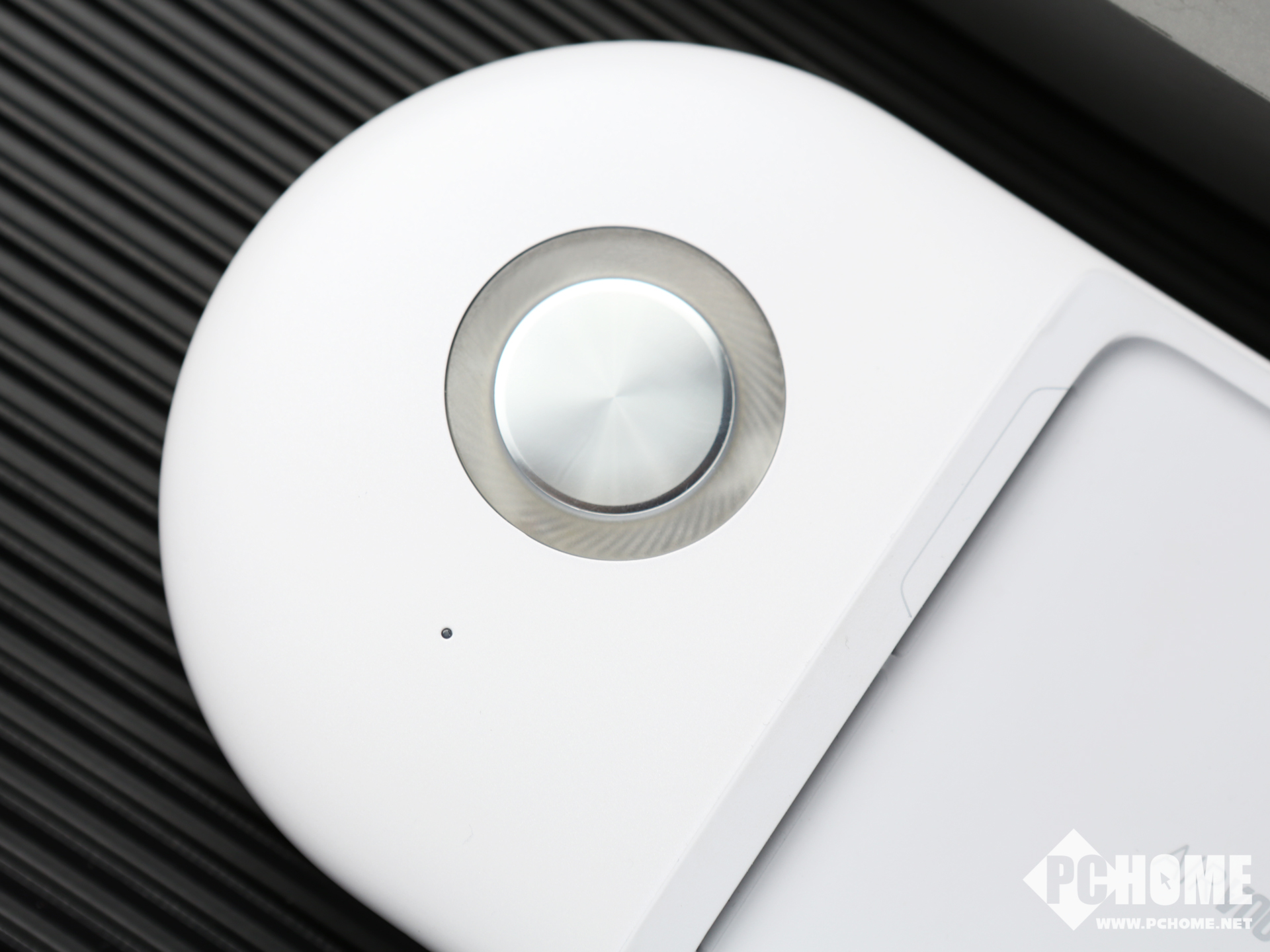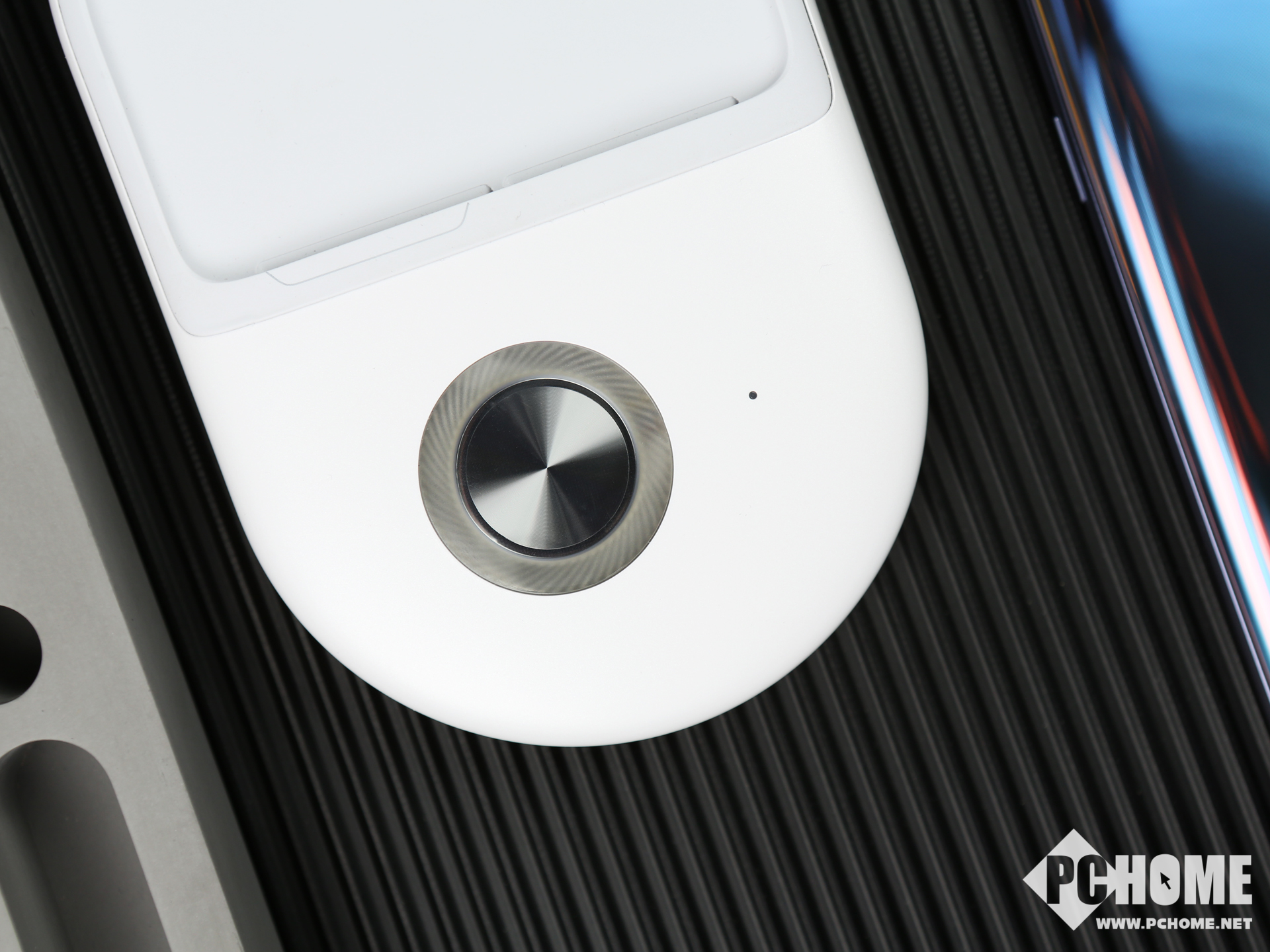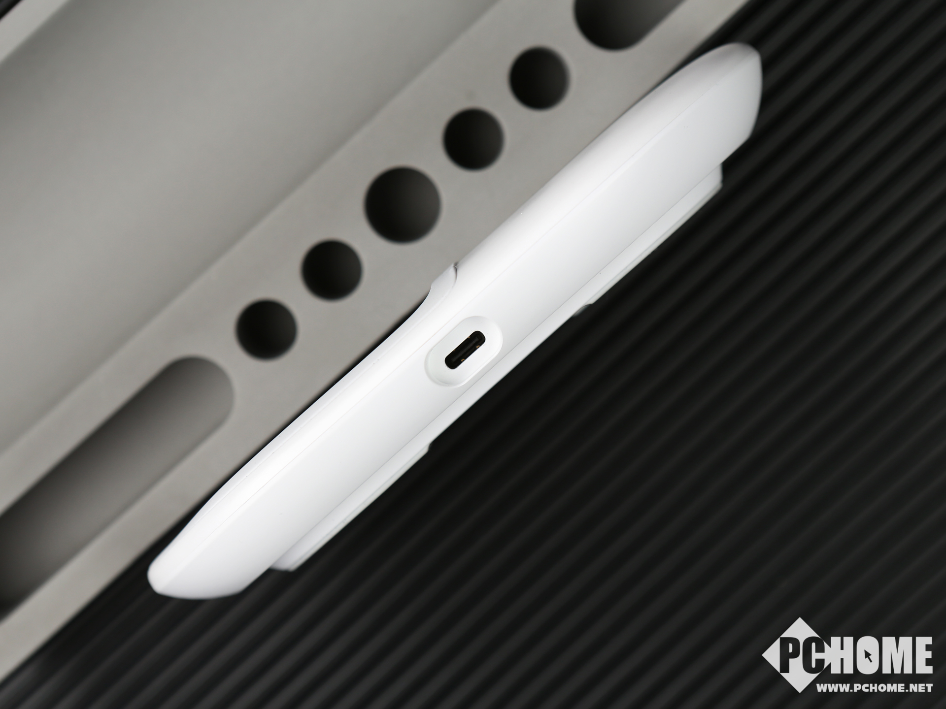 AirVOOC无线充电板整体采用的是硅胶+塑料的材质,通体为纯净的白色。在方式手机的位置采用了硅胶材质,一方面可以保护手机背板不被划伤,另一方面也可以使得手机平放在充电板上的时候不会随意的滑动,提供牢靠的稳定放置。而在塑料材质的位置则是一枚肉眼可见的镂空区域,上层覆盖有同心圆的高光金属片和一圈的透明塑料,可以清楚的看到里边的风扇扇叶,在充电的时候这部分扇叶也会进行转动,将内部的热量散出。翻到背部,可以看到AirVOOC充电板有非常大范围的散热开孔,为40W的高充电功率提供充足的散热效能,使其持续以最高充电功率运转。