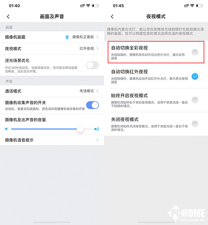 这两颗补光灯默认是关闭的,用户只需要在设置-画面及声音-夜视模式里进行调节。打开后,到了夜晚摄像机就会自动判断,打开暖光灯进行补光。