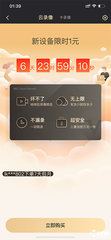 此外,凡是绑定激活产品的用户,7天内还可以享受新设备1元云录像的购买资格。只需要支付1元,即可享受7天滚动云录像包月的服务,开通后就能远程查看,非常方便。这样连存储卡的钱也省掉了。