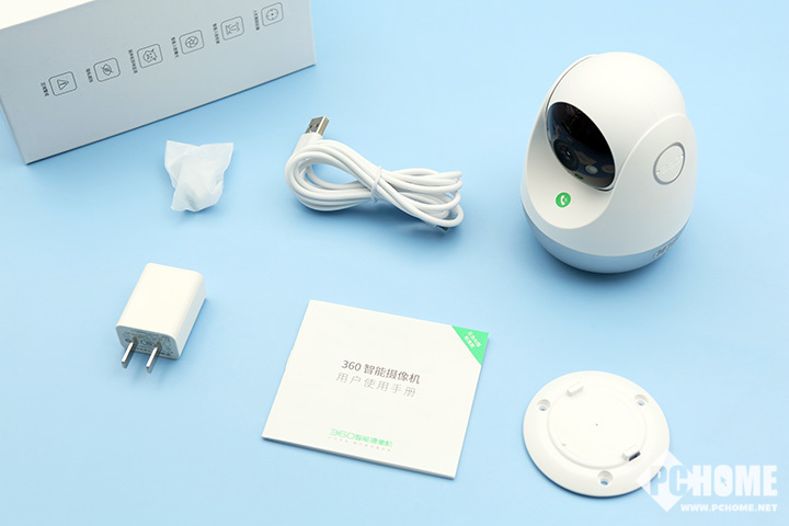 包装里的配件和其他版本的产品没有区别,依旧是摄像机、底座、充电器、数据线以及说明书。360智能摄像机云台AI版标准款支持三种摆放模式,分别是水平放置、壁挂安装(支架需另行购买)、吊顶安装。