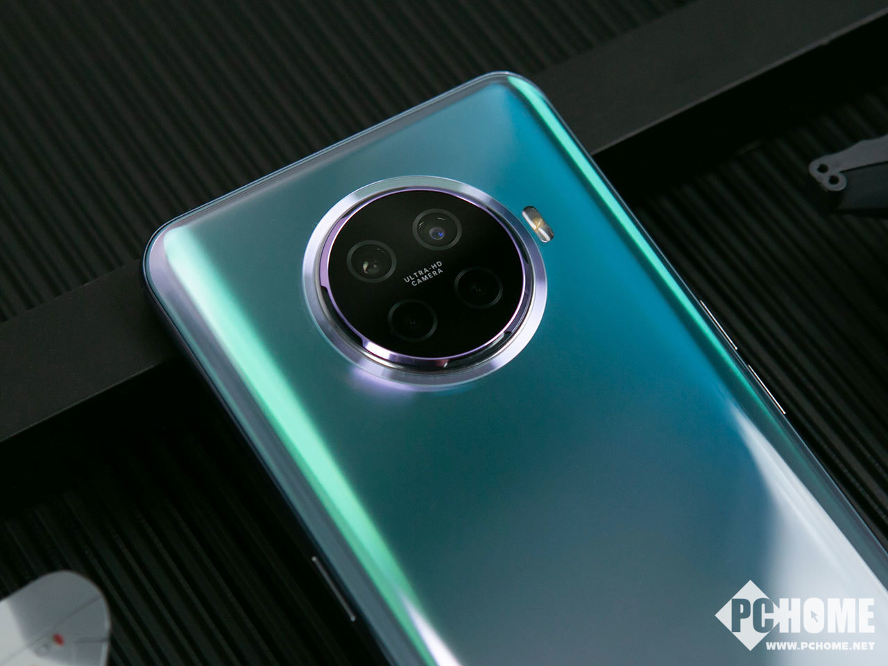 极光银配色不仅有自然界的神秘深邃之感,又渗透着几分赛博朋乐般的科幻气息,是技术与浪漫完美结合的典型范例。极光银配色对制作工艺有较高的要求,其背板采用双层膜片设计,底层为银色+光栅纹理,上层是绿色+光栅纹理,将两层膜片光栅纹理呈45°交叉,实现类似偏振光的效果,从不同角度可以看见不同的颜色。