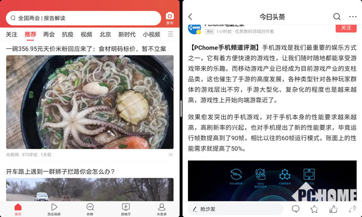 在购物类APP中,通过显示两个界面,系统会自动判断用户想要查看的内容,比如价格页面会始终保持在一屏,方便用户进行比价。与分屏模式一样,“平行视界”的窗口比例也是可调的。由于全球3000 Top APP均可兼容,基本上常用的APP都可以覆盖。
