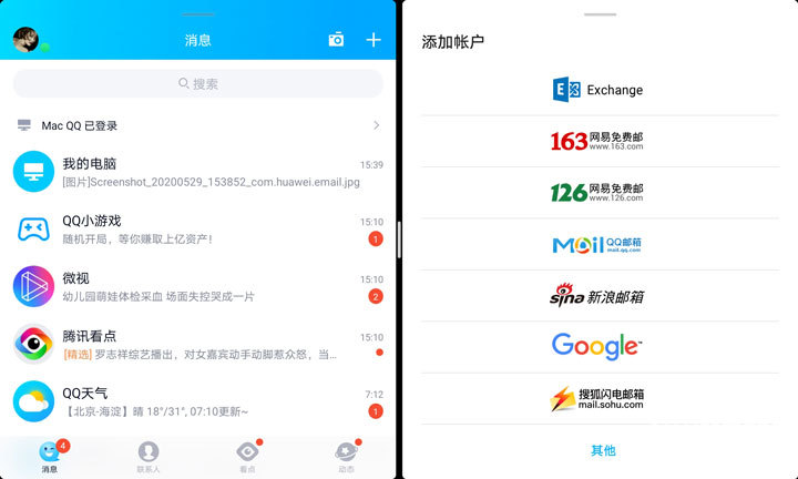 你也可以开启一个APP,将侧边应用栏中的APP长按拖拽到屏幕空白处(横屏状态下)或屏幕下方(竖屏状态下),一样可以同时操作两个独立的APP,两个APP默认占据一半的屏幕空间,同时支持手动调整单个APP所占据的窗口比例。一旦某个APP所占的窗口比例清零,则默认开启另一个界面容纳这个“无家可归”的APP。