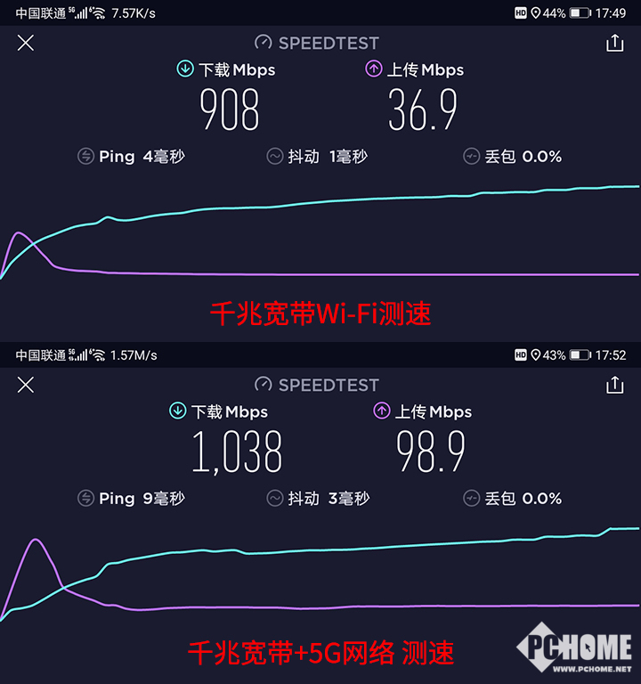 随后,我们将荣耀平板V6连至千兆带宽的荣耀路由3,使用5GHz频段Wi-Fi测速,可以达到下行908Mbps,上行36.9Mbps,抖动1ms的水准。如果我们打开LinkTurbo双通道网络加速,则可提升至下行1038Mbps,上行98.9Mbps,抖动3ms的水准。如此强悍的网络连接表现,足以让我送荣耀平板V6一句“恐怖如斯”。下面,我们实测一下荣耀平板V6的性能与续航能力。