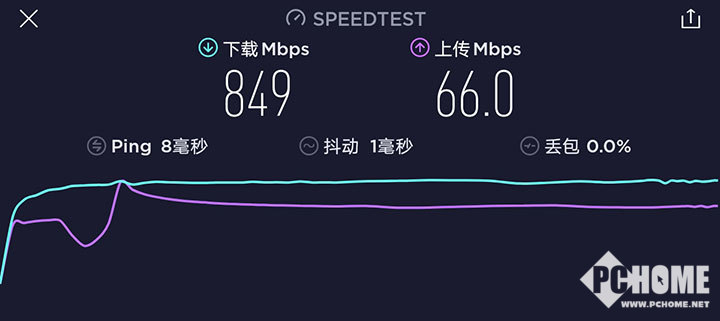 我们选用专业测速软件,测试5G网络条件下荣耀平板V6的传输速度。实测荣耀平板V6在5G网络下可以达到下行849Mbps,上行66Mbps,抖动1ms的水准,表现远超4G网络,甚至比很多品牌的5G手机表现还要出色。