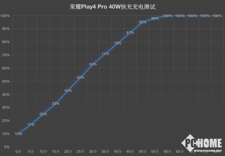 我们从10%开始进行充电测试,半小时即可充到63%,1小时充满,表现十分出彩。实测结果表明,10V高电压的充电方案充电速度更快,使得用户能够充分利用碎片化时间“回血”。此外,荣耀Play4 Pro还通过了德国莱茵安全快充认证,在充电安全方面遥遥领先。
