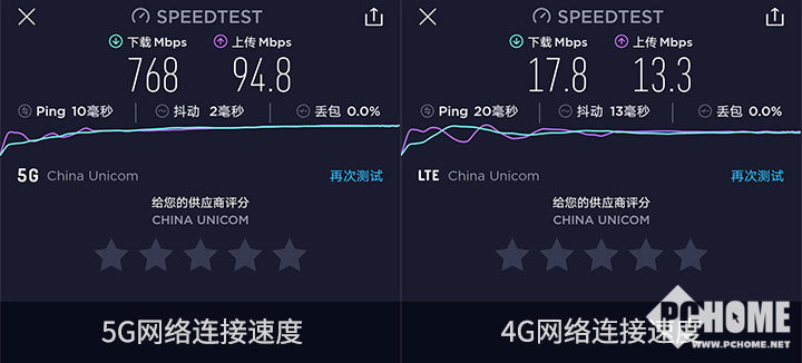 我们选用Speedtest,选用同一连接节点,分别测试5G网络和4G网络条件下荣耀Play4 Pro的传输速度。实测荣耀Play4 Pro在5G网络下可以达到下行768Mbps,上行94.8Mbps,抖动2ms的水准,在4G网络下可以达到下行17.8Mbps,上行13.3Mbps,抖动13ms的水准,速度差别相当巨大。