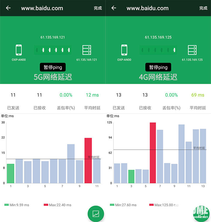 随后,我们打开Wi-Fi魔盒,测试在5G网络和4G网络下访问百度时的延迟。5G网络下,荣耀Play4 Pro最高延迟22.4ms,最低延迟9.59ms,平均延迟12ms。4G网络下,荣耀Play4 Pro最高延迟125.00ms,最低延迟27.60ms,平均延迟69ms。由此可见,5G网络的低延迟优势非常明显。