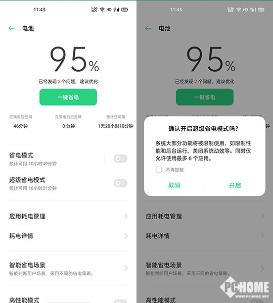特别要指出的是,OPPO还提供了超级省电模式,通过CPU调频、调整背光、对应用的针对性策略,达到极致的省电效果。开启超级省电模式之后,进行90分钟的微信文字聊天,耗电仅为5%。这样的表现足以让我们在手机低电量时不慌,毕竟1个半小时的微信文字聊天续航时间,是足够我们在不耽误事的前提下寻找到电源充电了。