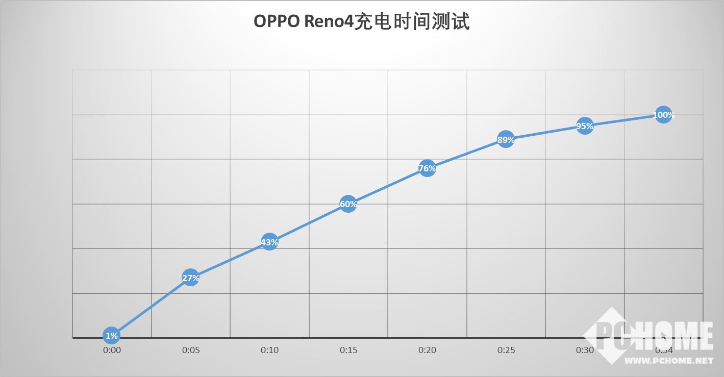 全场景智能省电与超级省电模式,其实只是OPPO Reno4续航表现的一部分,Reno4所支持的65W超级闪充是续航上的另一个重要保障,也是该机续航体验的最重要组成部分。这种快充技术运用电池串联的特点,提供的依然是低压快充的解决方案,具有高速、高转化率的特点。同时,整机的立体VC液冷散热系统能够快速导出热量,确保高效散热,进而保证充电效率。经过我们实测,OPPO Reno4从1%的低电量充至100%满电,总共耗时34分钟,充电效率极高。从充电曲线中看,低电量阶段的充电速度十分惊人,5分钟时间就能充电25%以上,足够满足高强度的续航需求。