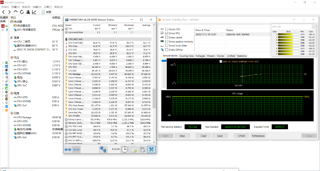 经过实测,在开启高性能模式后,在AIDA64长达15分钟的拷机(FPU)测试中,Ryzen 7 4800H的平均温度为92°C,此时CPU的功耗为35W左右,相比默认45W的TDP有所降低,全部八颗核心均维持在3.1GHz的频率下运行,温度控制与性能表现基本令人满意。