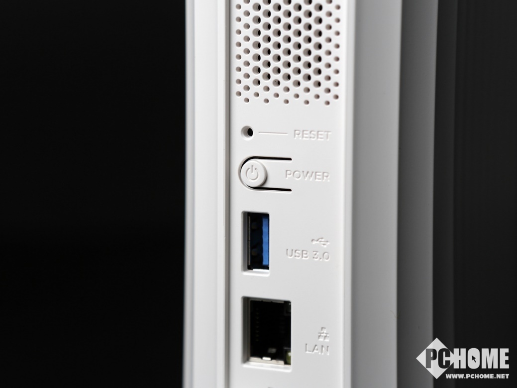 机身背部接口部分,依次为重置孔、电源键、USB3.0接口、RJ45网口(10/100/1000兆自适应)和电源插孔,电源适配器规格为12V\1.5A,采用圆形供电口。