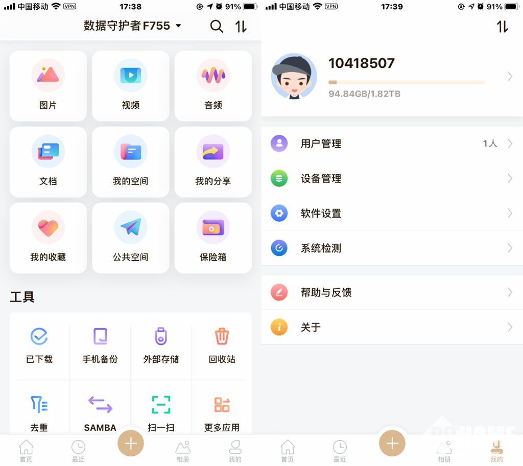 最近则是按照时间线列出了对设备进行数据操作的记录,包括上传、下载。在我的界面里,可以查看设备信息、升级固件、格式化磁盘式等操作。