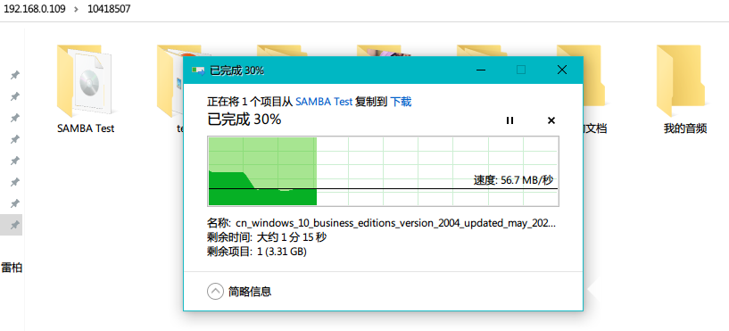 在Windows系统下,访问联想个人云存储A1的SAMBA服务器,进行文件下载,实测平均速度可达50MB/s以上,对于局域网成员之间进行大型工程文件、蓝光视频等文件的共享还是非常方便的。