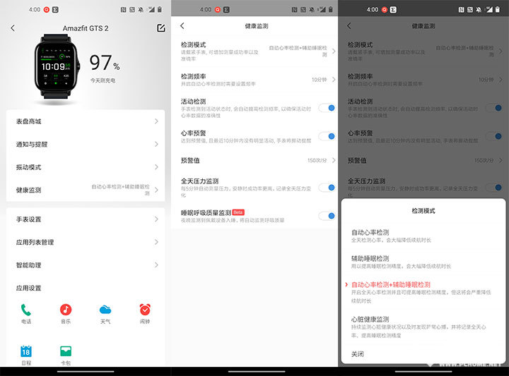 Amazfit GTS 2 智能手表搭载了华米自研的BioTracker 2 PPG生物数据传感器,在正确佩戴的前提下,能够实时检测用户的各项健康指标,包括但不限于心率、血氧饱和度、睡眠状态等,并将之汇总在“Zepp”APP首页。在“Zepp”APP的手表健康监测设置界面,用户可设置检测模式、检测频率,并在达到指定心率值后进行预警。此外,用户还可以开启活动检测、全天压力监测以及睡眠呼吸质量监测,进而带来全面的健康守护。