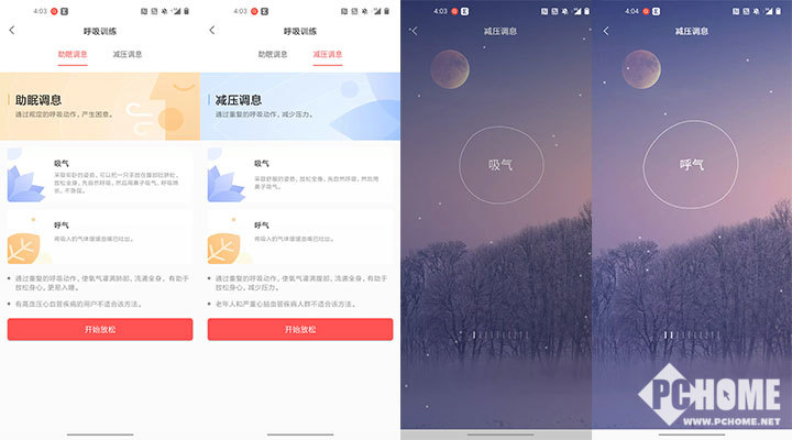 用户开启“减压调息”可进入助眠调息和减压调息选项,可在正确的姿势下通过呼吸吐纳的方式进行放松。但该方法不适用于老人、严重心脑血管疾病患者以及高血压患者。