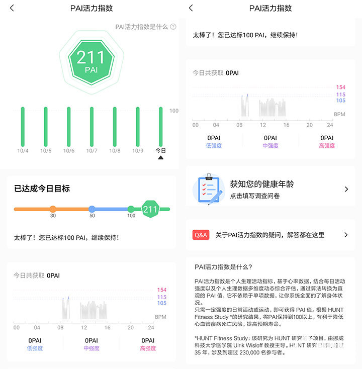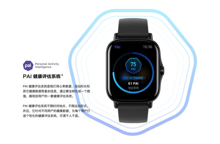 手表内置的“PAI健康评估系统”则可综合心率数据、活动时长等多项健康数据,通过算法转化为参考数值,不受时间地点和运动形式限制,具有较高的个人针对性。根据“PAI活力指数”,用户可制定并完成相应的健康目标,减少疾病风险,提高预期寿命。