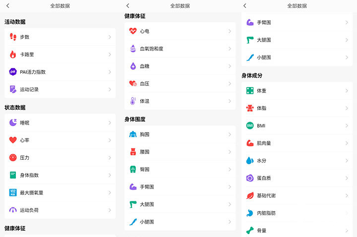 除此之外,在“Zepp”APP首页,用户还可以录入或检测自己的运动记录、身体指数、最大摄氧量、运动负荷、三围、手臂围、大腿围、小腿围、体重、体脂、BMI、肌肉量、水分、蛋白质等24项身体数据,还原自己的身体健康状态,并进行相应的数据汇总。