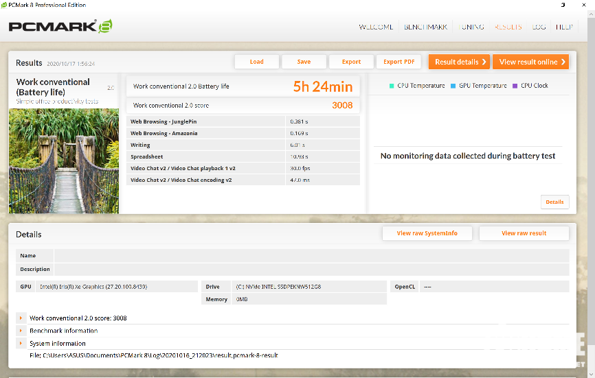 续航方面,华硕灵耀X纵横内置了67Wh容量的锂聚合物电池,考虑到机身厚度,这个电池容量属实难得了。我们采用PCMark8进行续航测试,在电量为100%时开始进行,性能方案选择更好的续航(Windows 10 x64 2004),屏幕亮度设置为60%,保持WiFi与蓝牙开启。